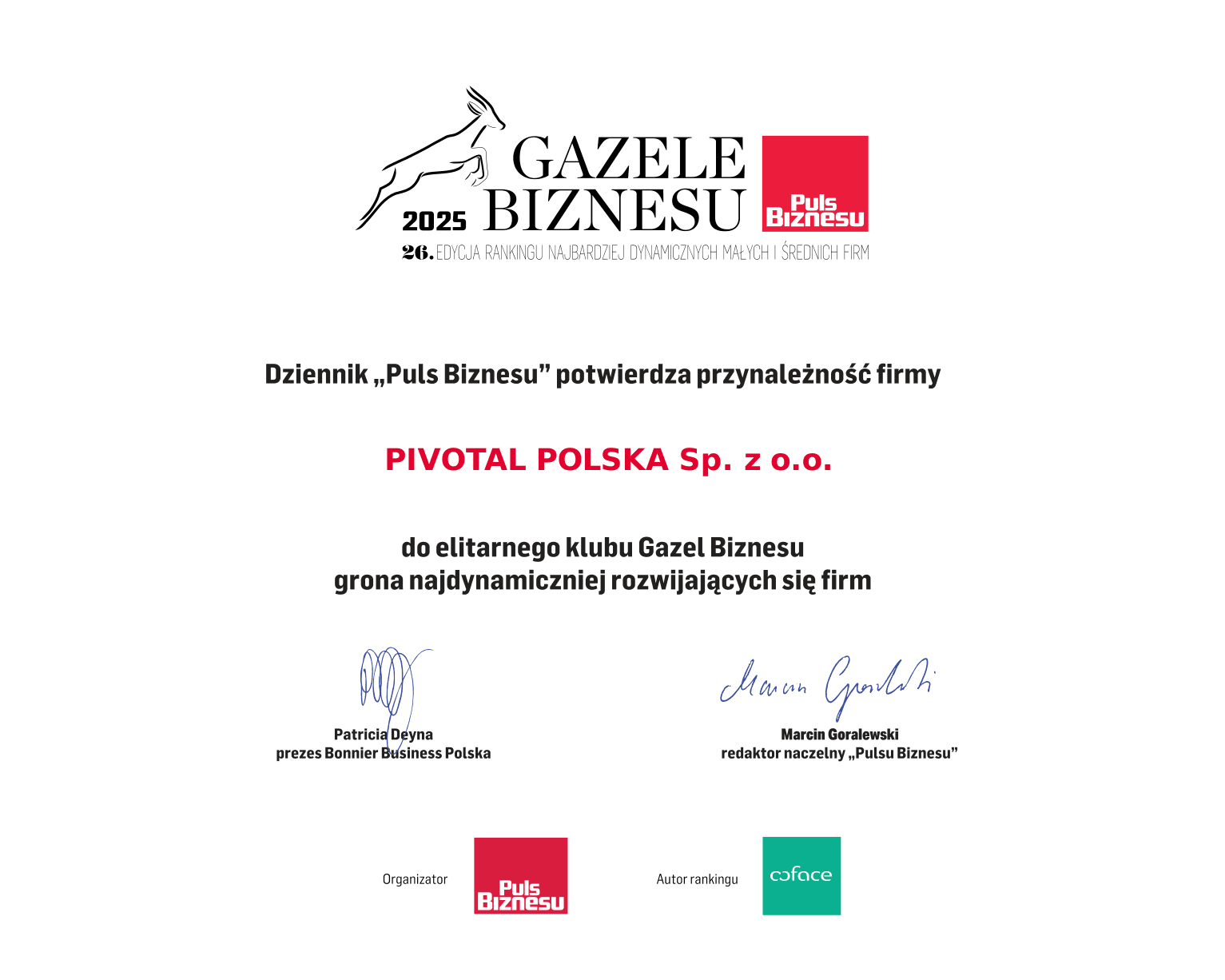 Dyplom Diamenty Forbesa 2025 potwierdza przynależność Pivotal Polska do grona najdynamiczniej rozwijających się firm w Polsce. Wyróżnienie przyznawane jest na podstawie analizy wyników finansowych, wartości firmy oraz tempa wzrostu.