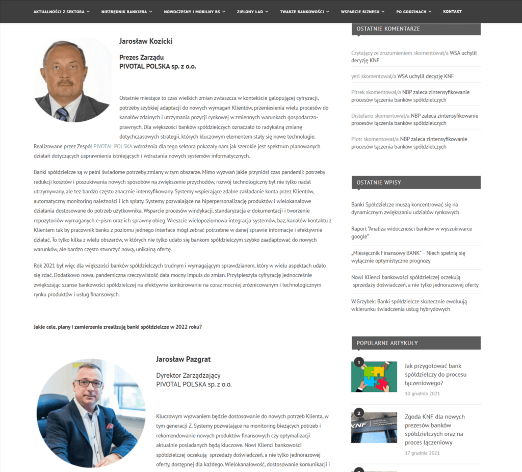 Portal BS-NET.pl opublikował wywiad z przedstawicielami Pivotal Polska: Jarosławem Kozickim - Prezesem Zarządu oraz Jarosławem Pazgratem - Dyrektorem Zarządzającym, który jest rodzajem podsumowania naszych działań w obszarze bankowości spółdzielczych i próbą wskazania kierunków rozwoju i kluczowych trendach w nadchodzącym, Nowym Roku 2022!