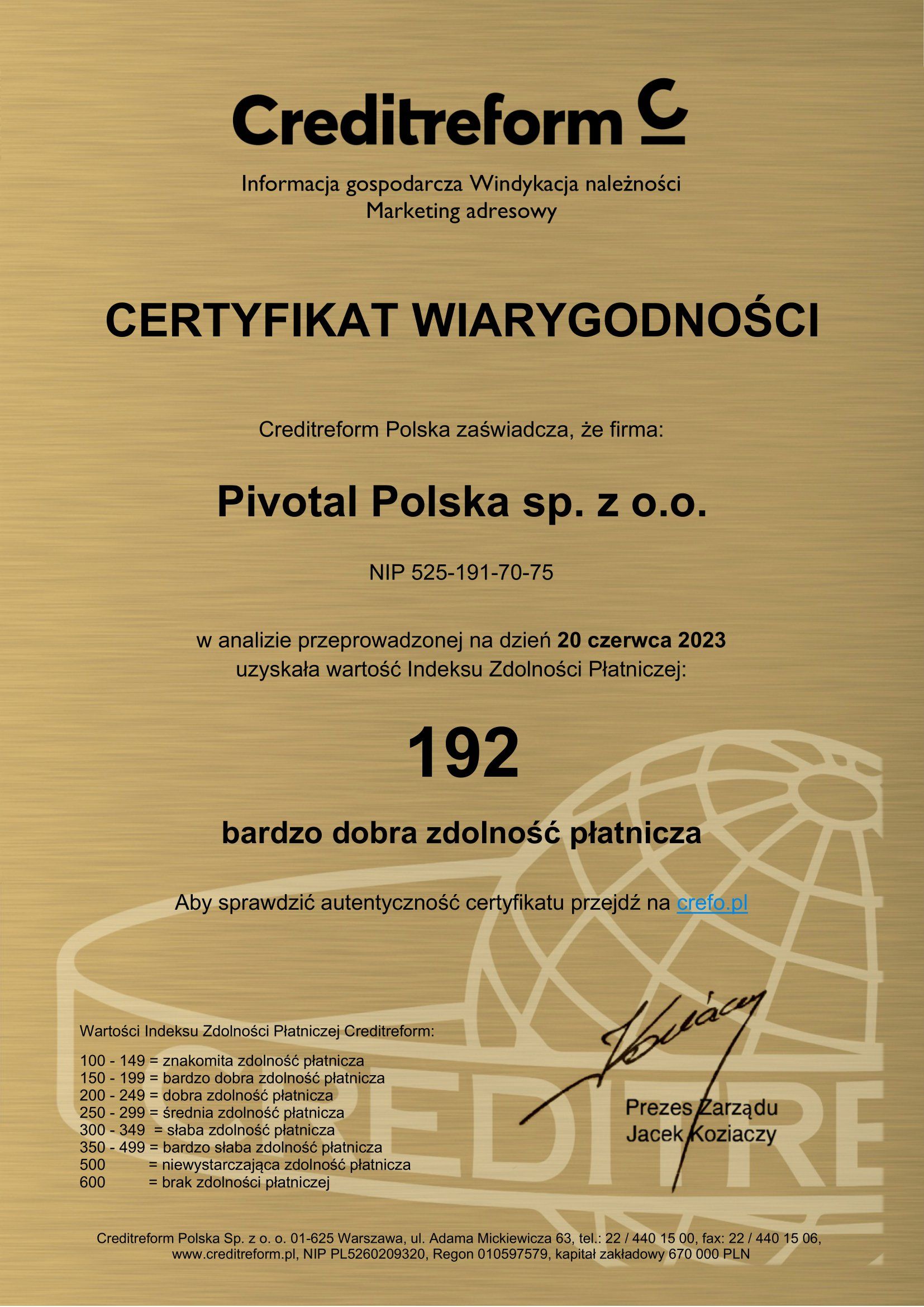 Pivotal Polska pozytywnie przeszedł procedury oceny i uzyskał CERTYFIKAT WIARYGODNOŚCI | Creditreform! Certyfikat potwierdza nasz potencjał finansowy, kluczowy w bieżących działaniach operacyjnych, rozmowach z partnerami biznesowymi, dostawcami i inwestorami.