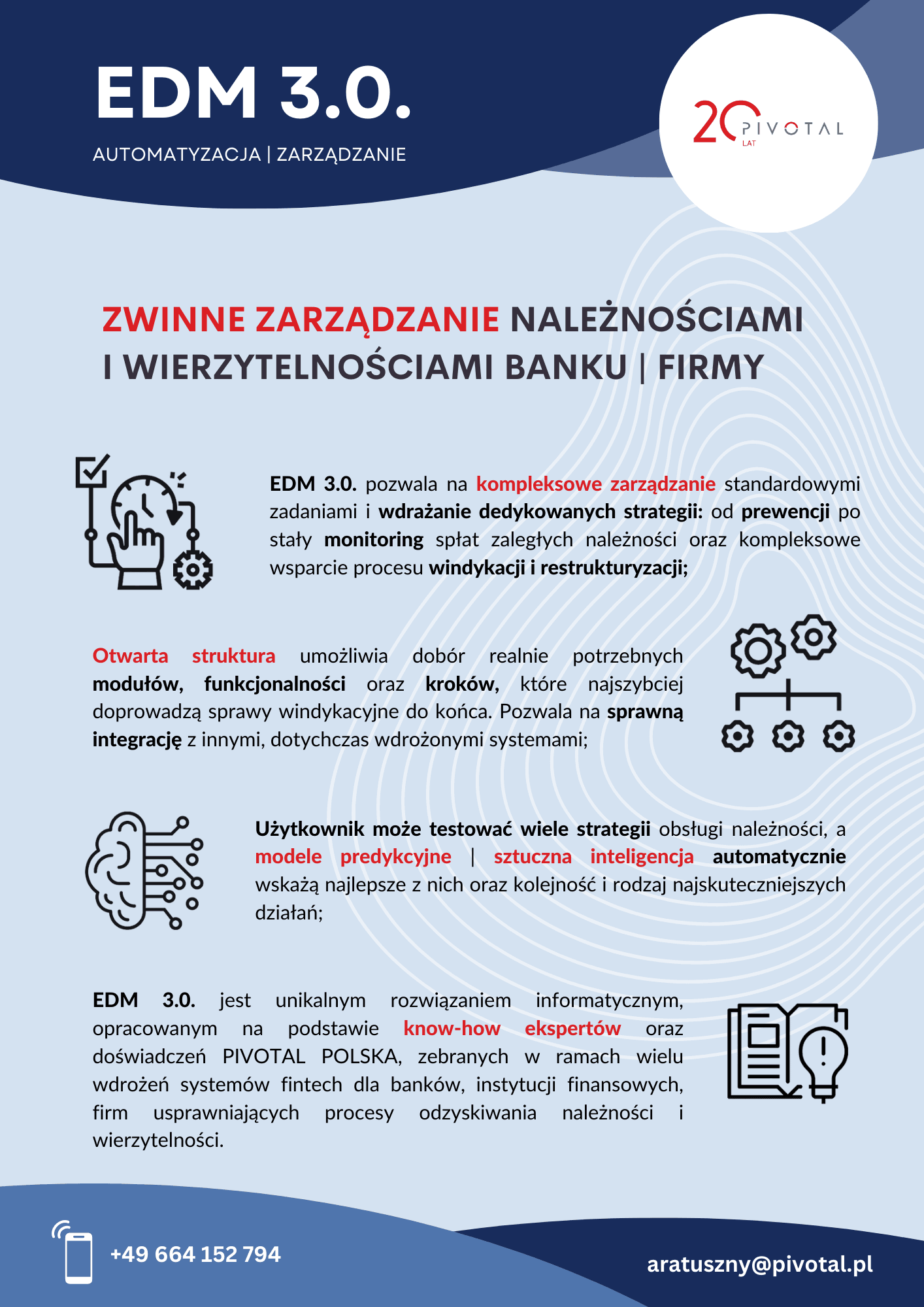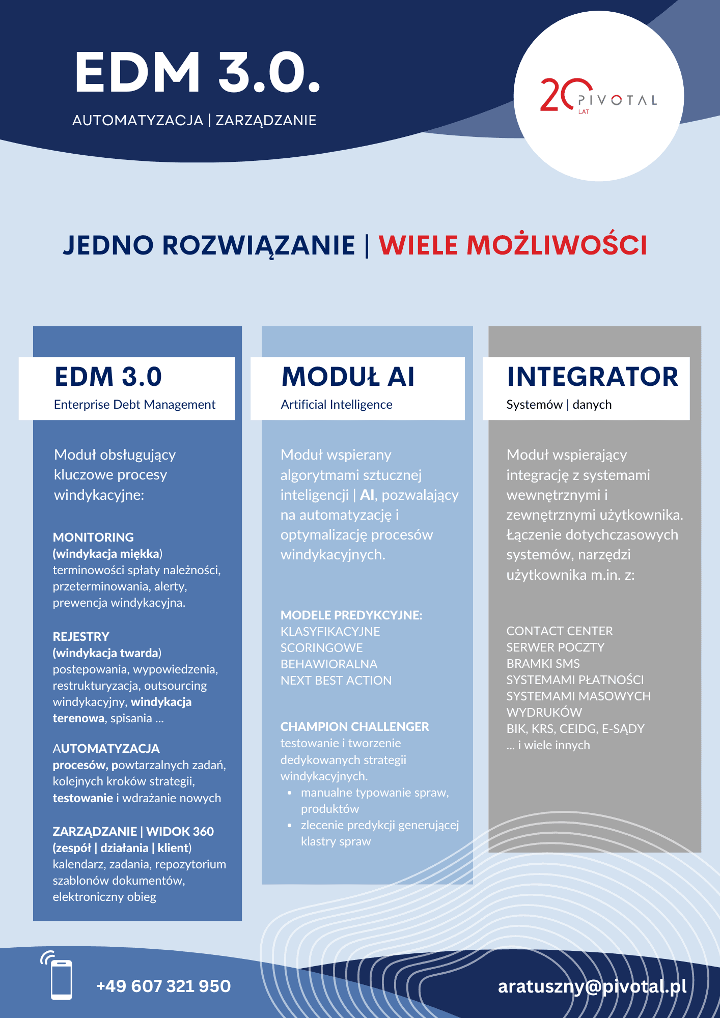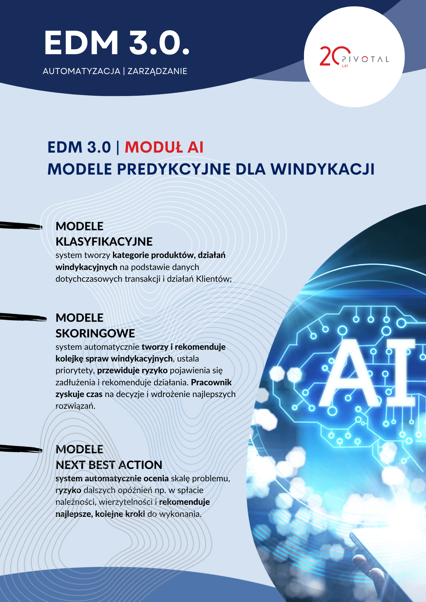 EDM 3.0. | MODUŁ AI jest efektem prac projektowo - wdrożeniowych PIVOTAL POLSKA, realizowanych w ramach projektu: "Opracowanie innowacyjnego narzędzia klasy SDC (ang. Smart Debt Collection) wspierającego procesy windykacyjne, Program Operacyjny Inteligentny Rozwój 2014-2020.
