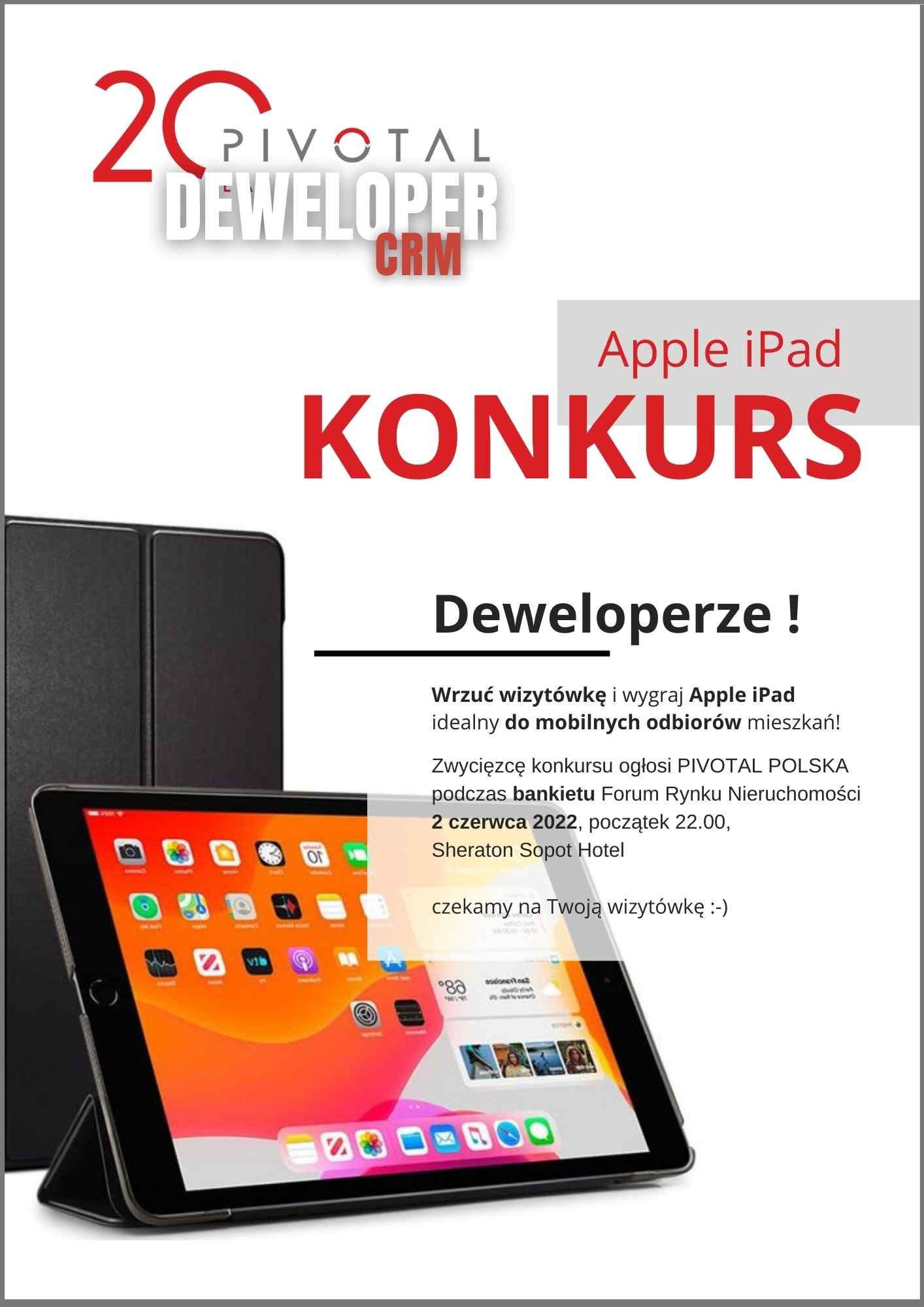 W pierwszym dniu forum (2.06.2022) Pivotal Polska zorganizował konkurs wizytówkowy podczas wieczornego bankietu biznesowego nazwanego przez organizatorów BUSINESS MIXER. Spośród zebranych wizytówek uczestników forum wylosowana została jedna, zwycięzcy konkursu. Pivotal Polska ufundował nagrodę specjalną iPad, który wraz z Pivotal Deweloper | CRM idealnie sprawdza się w mobilnych odbiorach mieszkań, Szybkie i sprawne przygotowywanie dokumentacji odbiorowej w terenie, zebranie pełnej informacji dotyczącej zwł. usterek i wad zidentyfikowanych w nieruchomości. System Pivotal Deweloper | CRM pozwala na szybkie wdrożenie napraw, minimalizuje ryzyko błędów, opóźnień (nowe wymagania ustawowe) i pozwala na prace z dowolnego miejsca, jednocześnie gromadząc potrzebne dane w jednym, centralnym repozytorium firmy deweloperskie.
