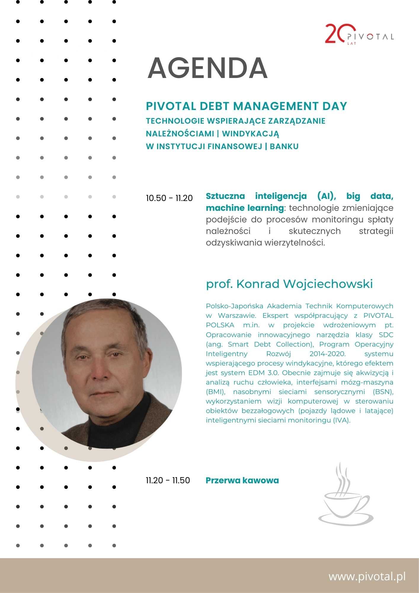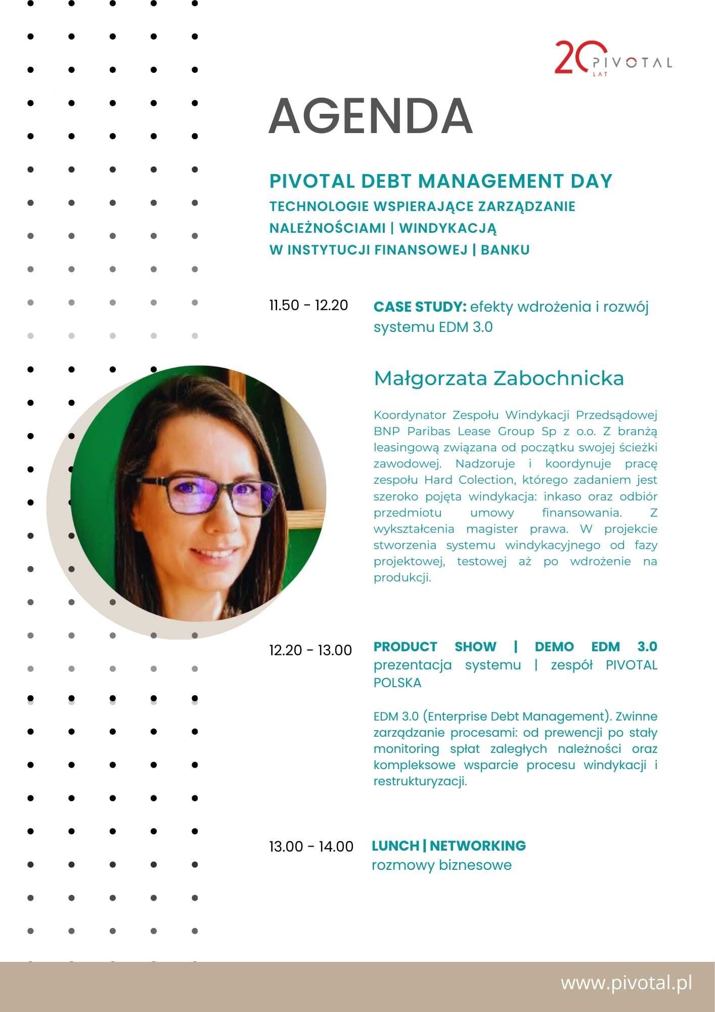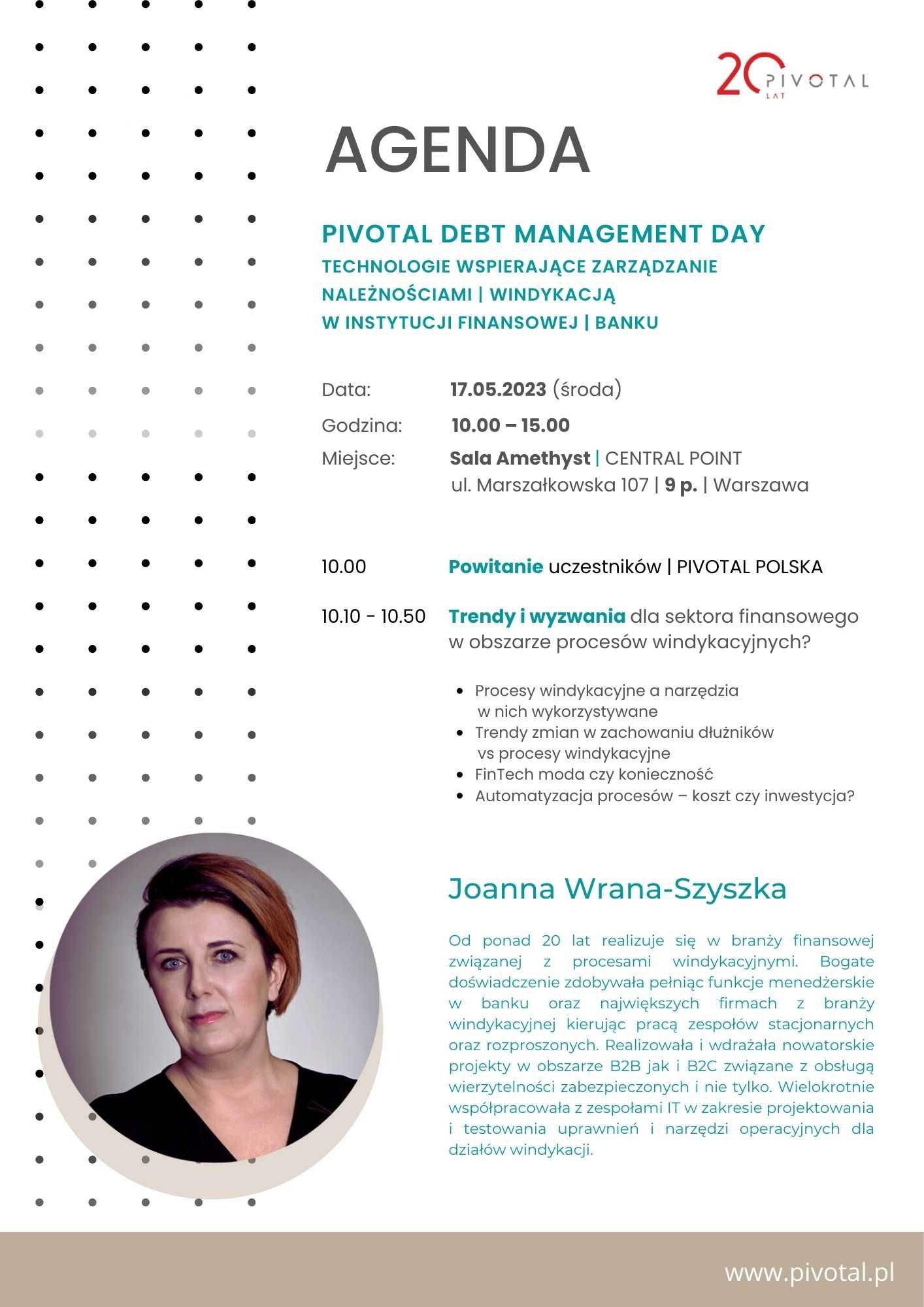 Mamy nadzieję, że Pivotal Debt Management Day będzie okazją do wymiany zdobytych doświadczeń i wiedzy dotyczącej aktualnej sytuacji w obszarze windykacji oraz rozmowy o bieżących wyzwaniach i potrzebach w tym obszarze i jednocześnie inspiracją do rozwoju i poszukiwania nowych narzędzi.